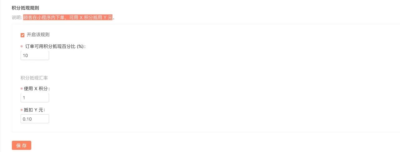 积分抵现规则:顾客在小程序内下单,可用 X 积分抵用 Y 元,X和Y的数值可自定义设置。