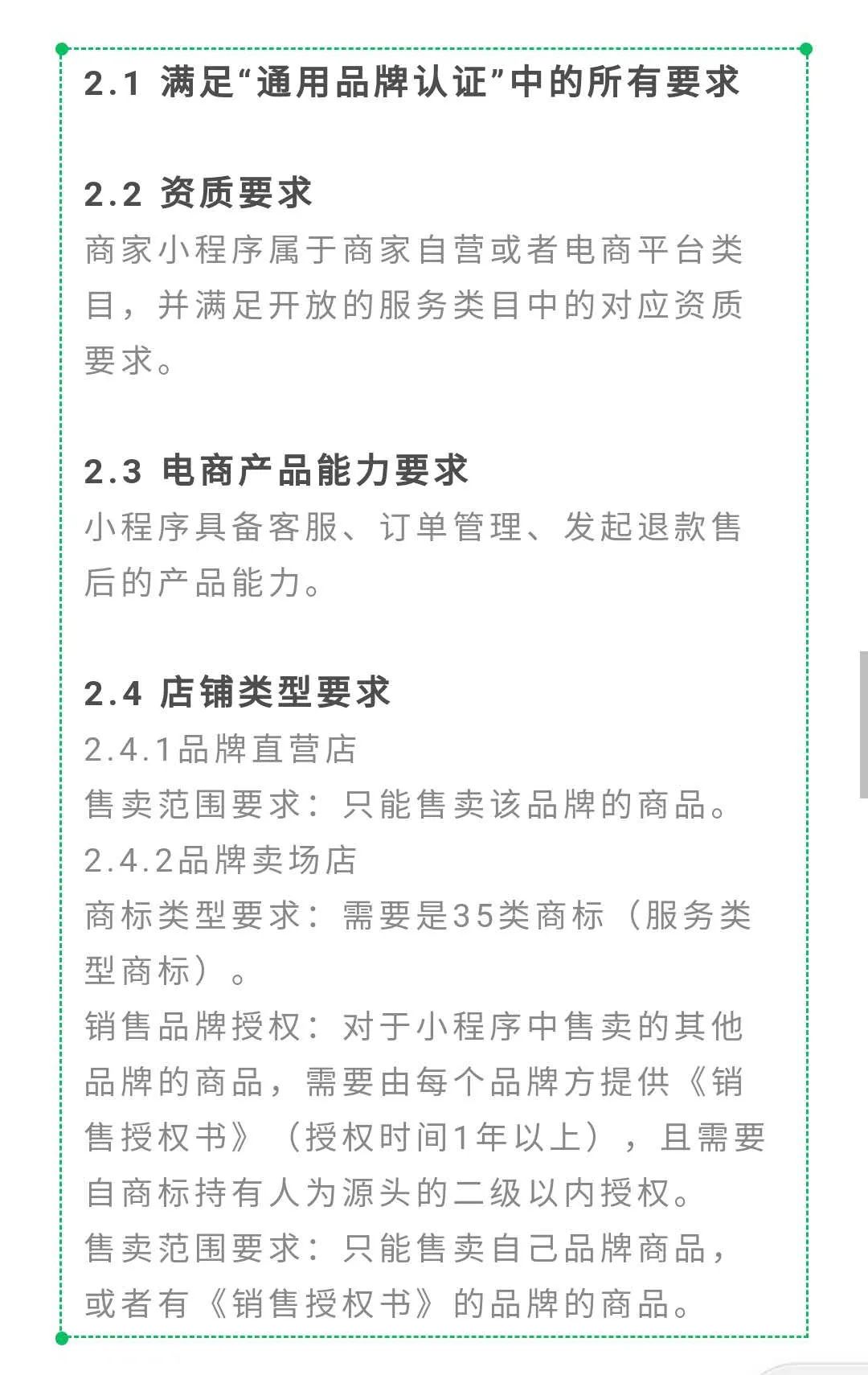 品牌小程序认证分通用品牌认证与电商品牌认证,需要符合不同的认证条件,电商品牌认证需要符合通用品牌认证的全部要求。主要条件表现在小程序主体相关信息、是否合规经营、小程序日常运营、品牌相关的证书资质这几方面。