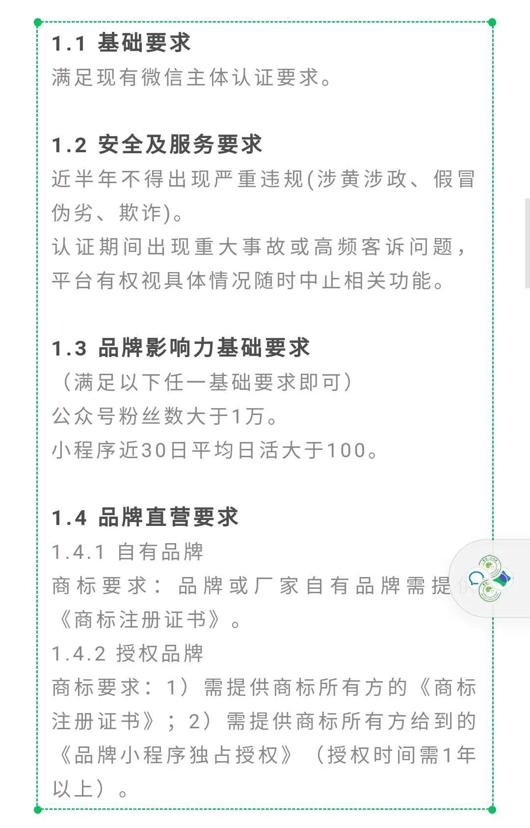 从认证条件来看,除了需要品牌所属的硬性条件外,还有很大一部分需要运营来完成,目前对运营的要求还不算太高“小程序近30日,平均日活>100”即可。