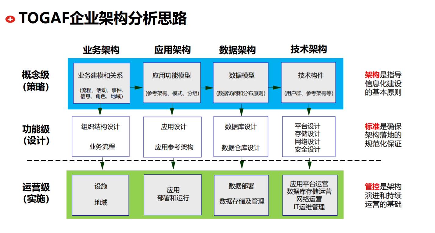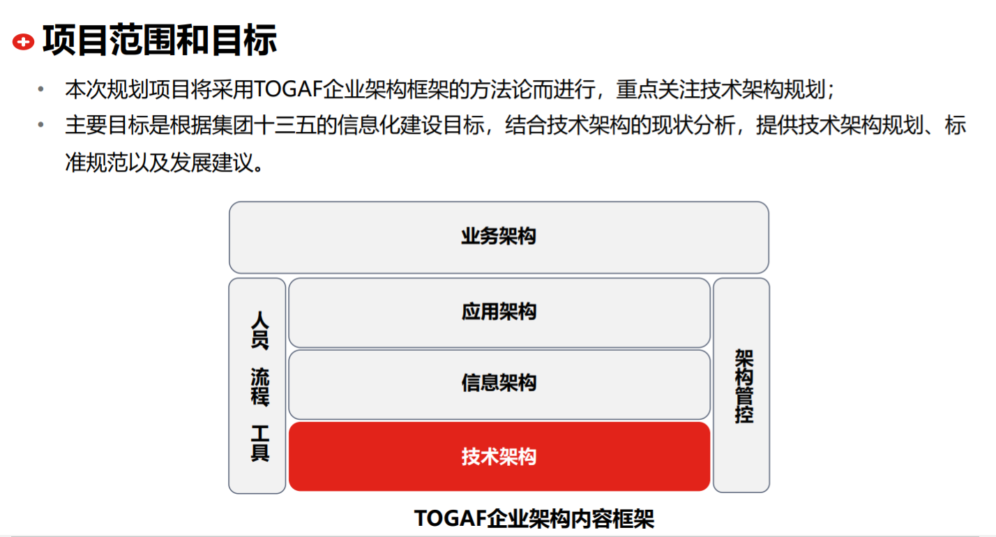 - 技术架构的设计内容主要包括:基础设施、技术平台、信息化标准和信息安全体系。