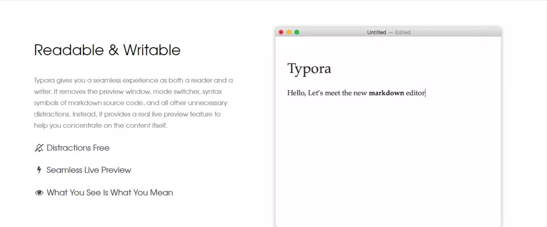 Typora 是一款轻量级Markdown编辑器,与其他Markdown编辑器不同的是,Typora没有采用源代码和预览双栏显示的方式,而是采用所见即所得的编辑方式,实现了即时预览的功能,但也可切换至源代码编辑模式。虽然是收费的买断制,但有15天的免费试用,试试不亏,推荐!
