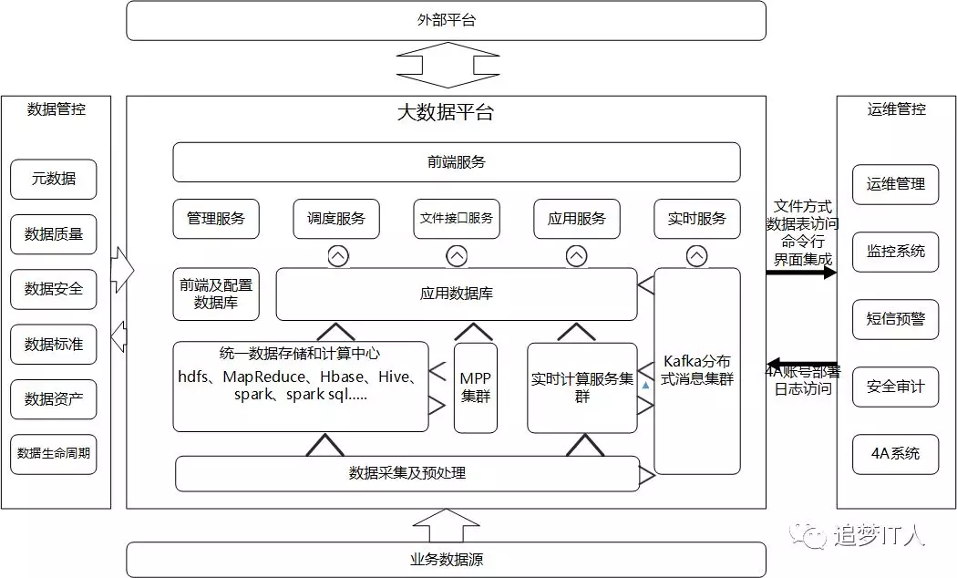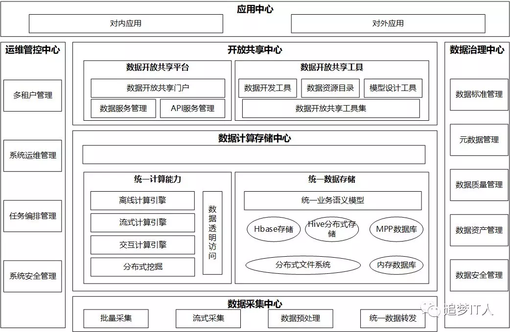 大数据平台则是指以处理海量数据存储、计算及流数据实时计算等场景为主的一套基础设施,包括了统一的数据采集中心、数据计算和存储中心、数据治理中心、运维管控中心、开放共享中心和应用中心。大数据平台之所以能够建设起来,不外乎内因和外因,外因是棱镜门事件带来的去IOE要求、外部硬件的变革和分布式开源技术的涌现;内因是非结构化、实时数据和海量数据的计算和存储压力,企业也寄希望从大数据平台除了满足对内需求,也能够实现一定的对外收益。