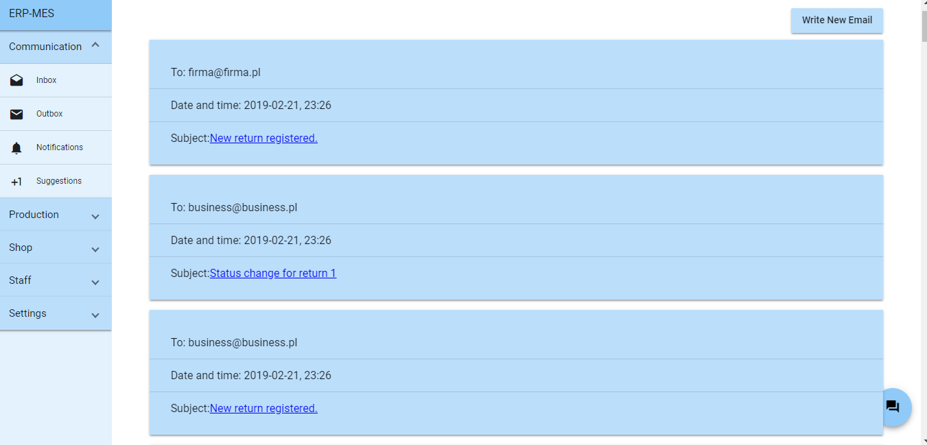 自动生成第一个登录密码并在注册新用户时通过电子邮件发送。发送给客户的订单/投诉/退货状态更改的自动通知。公司与其客户之间的电子邮件通信的可能性。