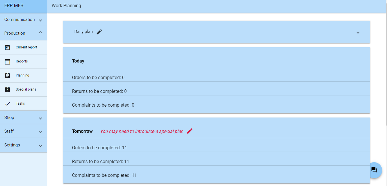 监控某一天计划的工作量是否不超过假定的每日计划,如果是 – 通知负责人。可以引入特殊的生产计划。确保所有订单、投诉和退货都得到及时解决。