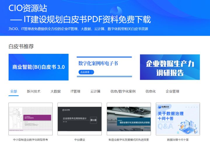 CIO资源站 – IT建设规划白皮书报告资料全站免费下载 (fanruan.com) 为企业CIO/IT管理提供IT建设、IT战略规划、新兴技术资料的一站式下载。不仅涵盖大数据、数据中台、数据治理等大数据相关技术的最新资料,还有许多关于数字化、信息化、新技术、IT管理等领域的学习资料。 每周上传10+全网最新IT建设资料,包含权威机构的白皮书、研究报告,还有华为、阿里巴巴、京东这些名企的一手资料,还有大佬演讲的PPT!
