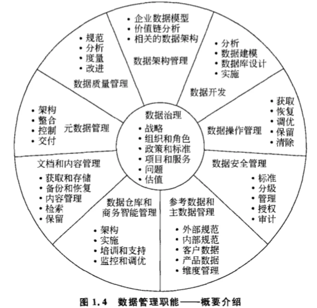 DAMA定义的数据治理包括战略、组织、政策、标准等内容,如下图所示: