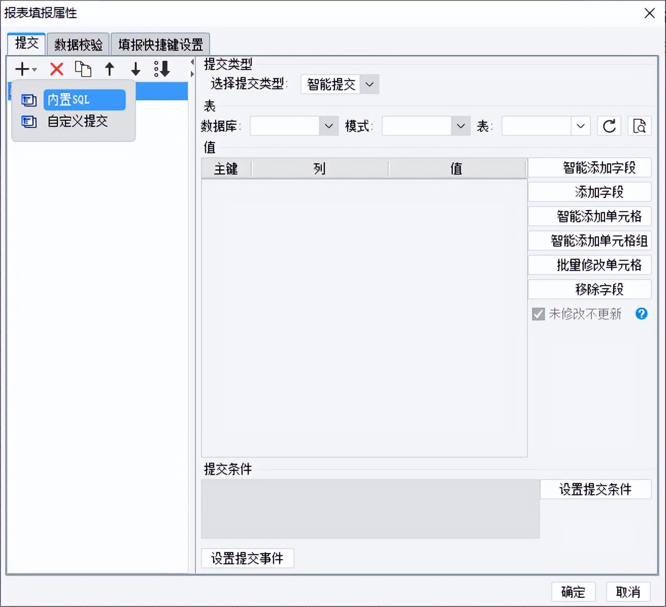 软件支持智能提交、插入提交、更新提交、删除提交等多种提交方式,同时还可设定当单元格未被编辑时不参与提交。为提高我们填报报表设计的易用性,还贴心提供智能添加字段、 智能添加单元格(组)等功能。