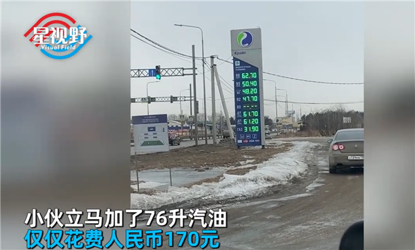 据@star星视频报道,3月12日,这位小伙子发现俄罗斯的92号汽油每升仅47.7卢布,约合人民币2.4元,他立马加了76升汽油,总共花费了170元人民币。