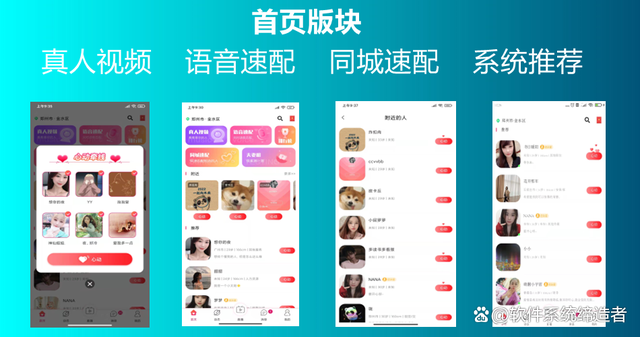 (1)速配约聊功能:用户可自主选择视频或语音聊天,同一时间内开启匹配的用户即可速配约聊成功,结束后自动根据语音或视频时长进行价格结算。