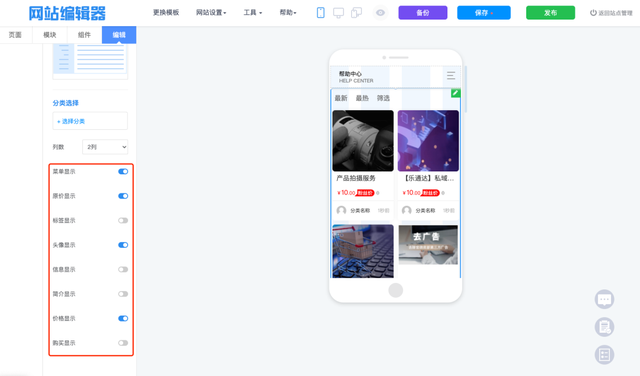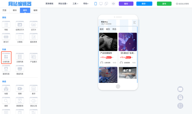 3)网站编辑器 – 组件 ,建议多使用分类列表可显示包括文章、商品、案例等内容列表,并可自由开关是否要显示的内容,还可以设置色调等。