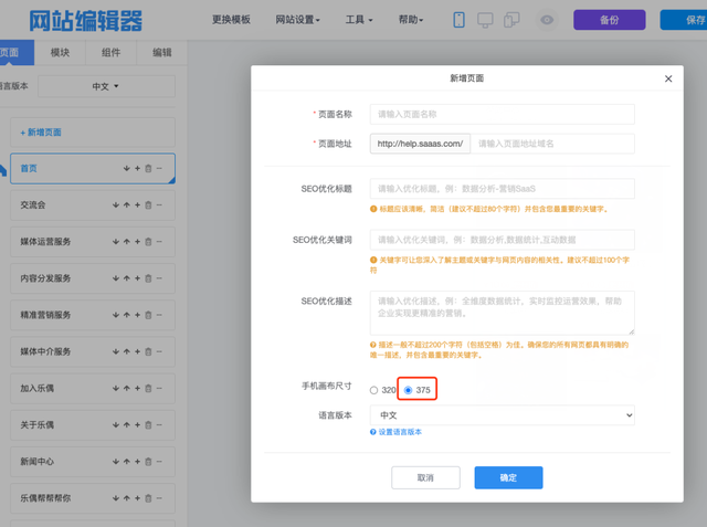 2)网站编辑器-新建页面,手机端页面建议选择375画布尺寸,做出的网页更精美。