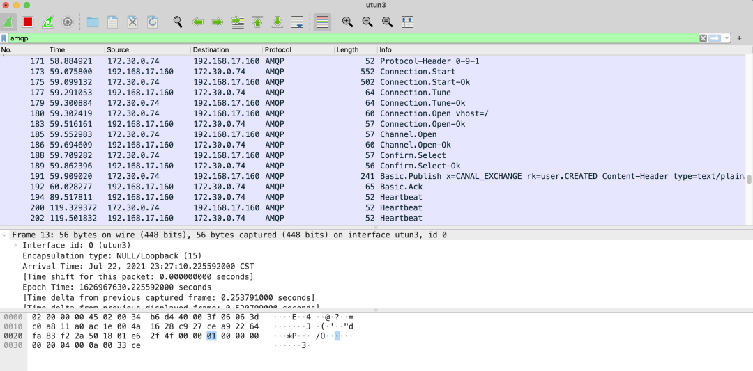 整个 AMQP 协议的交互流程(172.30.0.74 为客户端即本机 ip;192.168.17.160 为 RabbitMQ Broker 的 ip)