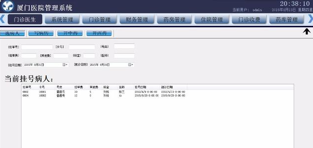 3)门诊管理(病人挂号、代办医疗卡、退号、挂号表查询、医疗卡补办)。