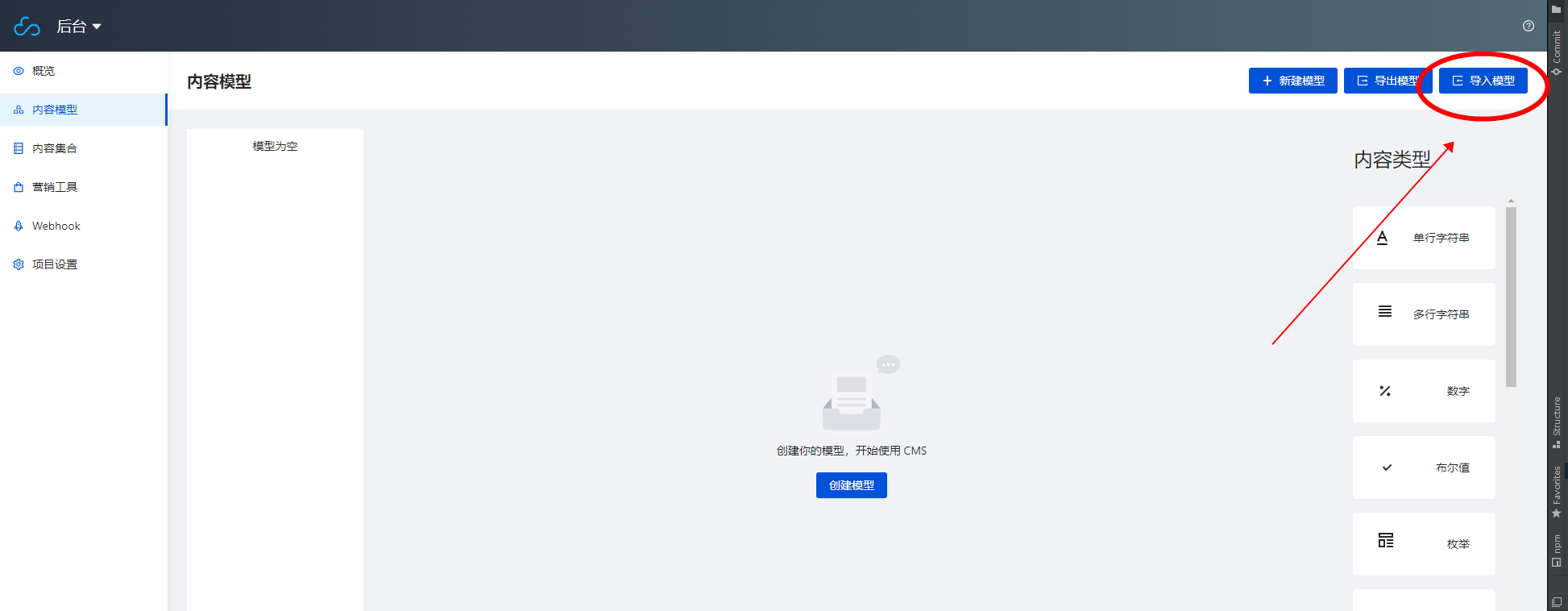 5、打开内容模型页面,找到代码根目录的cms.json文件,选择该文件导入