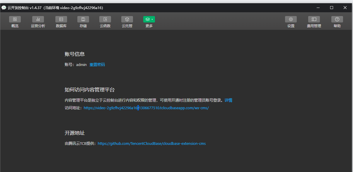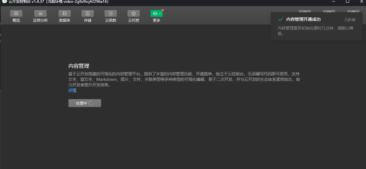 1、首先打开云开发的后台,点击【更多】【内容管理】,开通内容管理