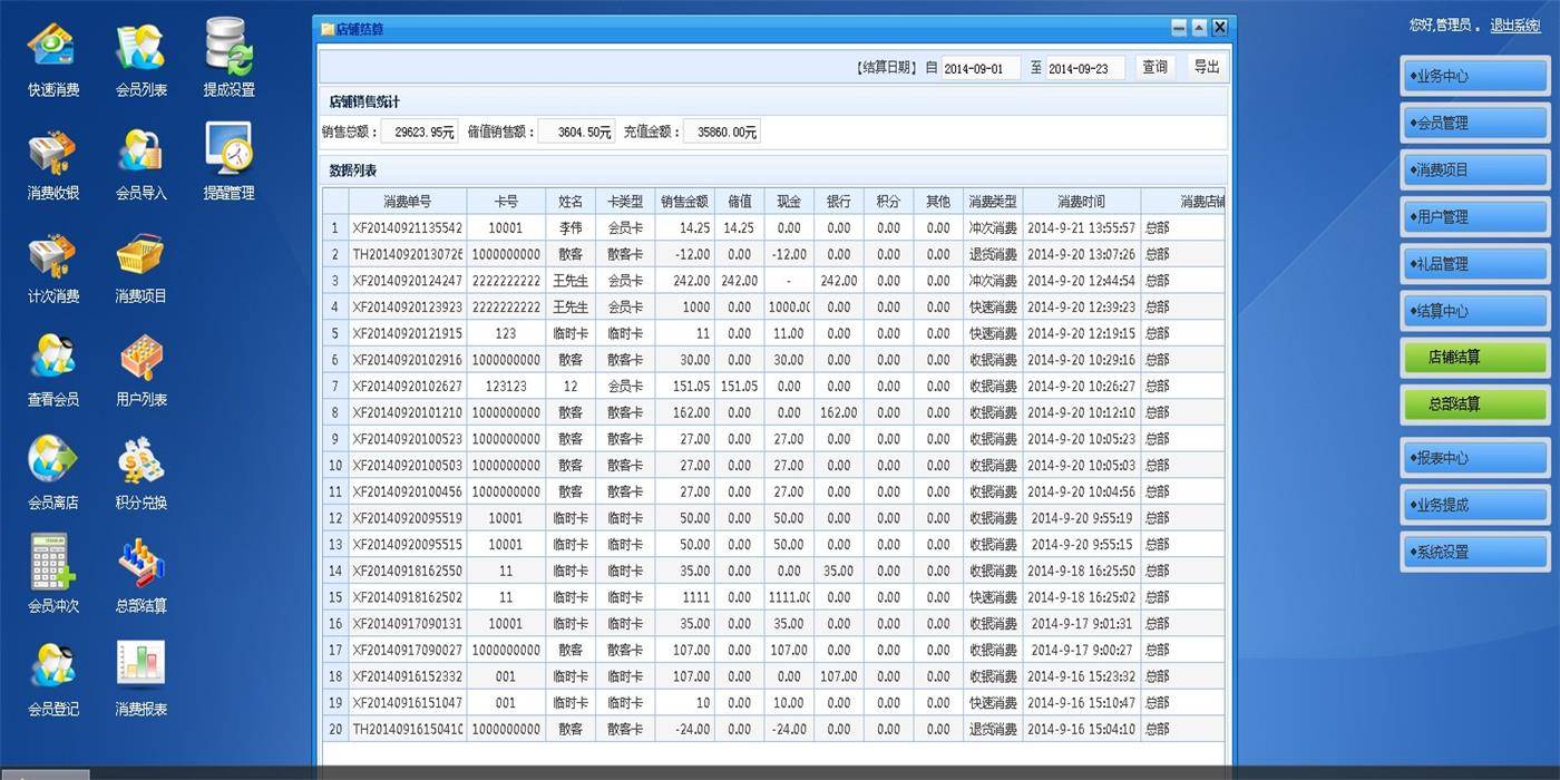◆结算中心(店铺结算总部结算)◆报表中心(会员报表充值报表消费报表消费统计人流量统计)