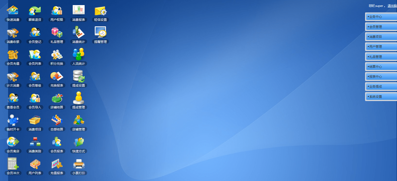 ◆业务中心(快速消费消费收银会员充值计次消费查看会员临时开卡会员离店会员冲次顾客退货)