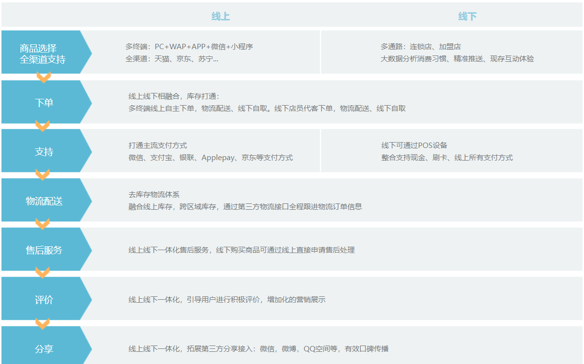 多方面打通零售业PC端,移动端,线下门店端,真正帮助零售商业企业形成前端和后端,线上与线下为一体的全渠道零售体系,重构消费者,商品,消费场景关系,实现三维一体化管理。