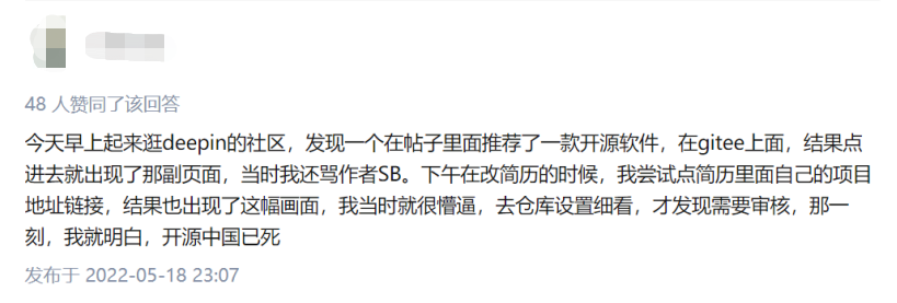 Gitee开发者:项目被封了 5月18日,大量开发者反映自己Gitee上的开源项目,发现被关闭公开访问了。 图片来源@Gitee网站截图 对此,Gitee的答复是:“此举也是迫于无奈,目前已经是Gitee团队能确保大家尽快正常使用的最优解,我们正在尽全力减少大家的不便,希望大家能够理解。” 图片来源@知乎 这一事件引发了广大开发者的讨论。有人认可Gitee的这种做法: 图片来源@知乎 有人对这种一刀切的做法表示不满: 图片来源@知乎 Gitee审核事件背后的“不得已” Gitee又名码云,是OSCHINA.NET(开源中国)推出的代码托管、协作开发平台,支持Git和SVN,提供免费的私有仓库托管,其作用可以类比GitHub。 因为一些原因,国内开发者访问GitHub会出现速度过慢或无法访问的情况,因而国内的很多开发者就选择了Gitee,目前在Gitee上也有不少优秀的开源项目。 总的来说,Gitee对国内开发者还是比较友好的,只是,正如之前的文章《GitHub封了41万俄罗斯开发者账户,开源真的无国界?》提到的,相比于GitHub有7300多万的开发者,400多万的企业客户,2亿多代码仓库,Gitee只有800多万开发者,20多万的企业用户,2000多万的代码仓库,主要指标差了一个数量级,因而在代码搜索方面Gitee有一定的劣势。 尽管存在这样的不足,Gitee还是一定程度上推动了国内开源的发展。 应当说,此次Gitee突然执行开源仓库审核后上线的措施,还是给不少开发者带来了不便,特别对是那些有几十上百个仓库的Gitee老用户来说,如果他们想尽快将仓库恢复公开,很可能需要一个一个地去提交申请。 难怪有开发者会抱怨“平台方为什么不为用户设定一个缓冲期,提前通知,在缓冲期内完成审核?” 为什么Gitee在没有告知的情况下就关闭了所有开源项目的公开访问权限呢? 对此,Gitee并没有明确的回应和解释,但从提交仓库公开的申请时平台给出的提示猜测,有可能是有人利用Gitee做了一些不合规的事情,被有关部门要求进行内容审查了。 图片来源@Gitee网站截图 考虑到此前某书、某园等社区都曾因为出现违法违规信息而进行为期数天乃至数十天的全面彻底清理整顿,如果真有哪个仓库违反了法律法规,Gitee也会面临类似的风险。 也许这就是为何Gitee会在没有提前公告的情况下,突然执行开源仓库审核后上线的措施。 “互联网不是法外之地,政府需要监管”,这个道理很多开发者并非不能理解,特别是一些开发过内容类网站的开发者,更清楚内容审核对平台的重要性。 但他们还是觉得Gitee的做法过于简单粗暴了,有开发者质疑此类审核的意义:“我一开始创建了一个README,然后接着我就提审了,变成公开仓库了,然后我后面再commit、push 一些奇怪的内容,这不照样还是有风险吗?做到真正规避了吗?如果不是每个commit都审核,那做这个审核到底还有什么意义呢?” 在他看来,Gitee最理想的做法是做一个全站代码风险和版权检测工具,去自动搜查非法内容,如果发现了非法仓库,就将该仓库转为私有。 其他开发者也有类似的建议,他们认为如果条件允许的话,平台可以做出一些简单的工具来帮助开发者们快速恢复自己的仓库,或者建设一套完善的自动化审核流程,先机审再人审,如果有误审再允许开发者提交申诉。 网友吐槽:审核会影响开源的发展吗 在得知Gitee仓库开源须审核通过后才能公开这个消息后,有人担心国内的开源精神将会就此萎缩。 图片来源@知乎 或许这只是部分人宣泄情绪的方式,未必是他们的真实态度,但我们还是要问,这件事会影响国内开源的发展吗? 可能不会。加强监管和审核,并不是Gitee一家的做法。本月初,GitHub正式宣布:要求所有代码贡献者在2023年底之前启用双重身份认证。要是不启用这个功能,以后就不能往GitHub仓库里提交代码了。 所谓双重身份认证(Two-Factor Authentication),就是在账号密码以外还额外需要一种方式来确认用户身份。GitHub的这一做法在用户中间也充满了争议。 吃过软件供应链攻击苦头的开发者非常支持这一做法。 图片来源@网络 而部分开发者表示反对,并吐槽该认证的糟糕用户体验。 图片来源@网络 从大环境来说,有关部门不仅没有限制开源的打算,还大力支持开源的发展。 去年11月30日,工业和信息化部召开新闻发布会,发布《“十四五”软件和信息技术服务业发展规划》。 在发布会上,工信部信息技术发展司软件产业处处长王威伟表示,开源能够集众智、采众长,加速软件迭代升级,促进产用协同创新,推动产业生态完善,已成为全球软件技术和产业创新的主导模式。可以说“软件定义未来的世界,开源决定软件的未来”。 王威伟还表示,目前,我国已成为全球开源生态的重要贡献力量。下一步,工信部将不断繁荣国内开源生态,重点做好以下几个方面的工作: 一是夯实开源发展基础。发挥开源基金会等专业组织牵头引领作用,完善开源治理机制和治理规则,推广开源理念。加快建设开源代码托管平台等基础设施。 二是打造开源软件品牌。借鉴国际开源项目成功经验,建立完善生态链各方积极参与的开源社区,面向重点领域孵化一批基础性、前瞻性的开源项目。 三是加快普及开源文化。不断完善开源软件生态治理体系,引导企业、高校、开发者了解开源、学习开源、使用开源、回馈开源,扩大开源生态的社会影响力。 四是加强开源治理国际合作。着眼全球,推广我国优秀开源项目,吸引世界开发者广泛参与,助力我国软