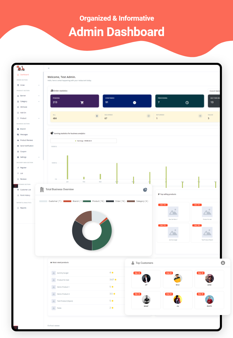 分店管理、订单管理、食品类别和子类别管理、食品变化和插件管理、食品项目和套餐管理、与客户聊天、发送自定义通知、优惠券管理、客户管理、送货员管理、丰富的分析和报告、餐厅业务 设置