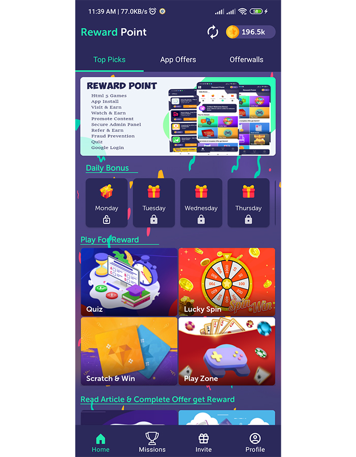 Reward Point – Html Games + Offerwall 是想要赚取现金的用户的最佳APP。 有很多赚取现金的选项,用户可以通过下载APP+邀请朋友赚取现金,也可以通过观看视频、完整的报价、玩测验、Pkay 游戏赚取简单的应用程序漂亮的界面和管理面板。