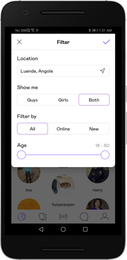过滤器和位置过滤器:过滤您想看到的人的类型、在线、年龄、位置等……