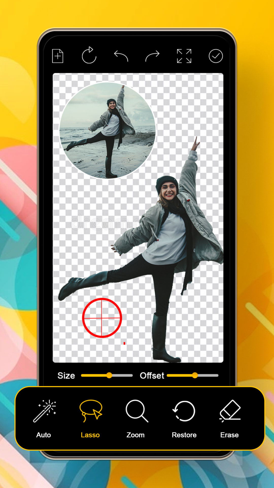 Ultimate Background Eraser 提供了一种快速简便的方法来更改照片背景。 只需触摸您要擦除的区域,自动橡皮擦工具将为您完成剩下的工作。 您还可以通过手指触摸或使用套索(图像切割)工具手动擦除照片背景。