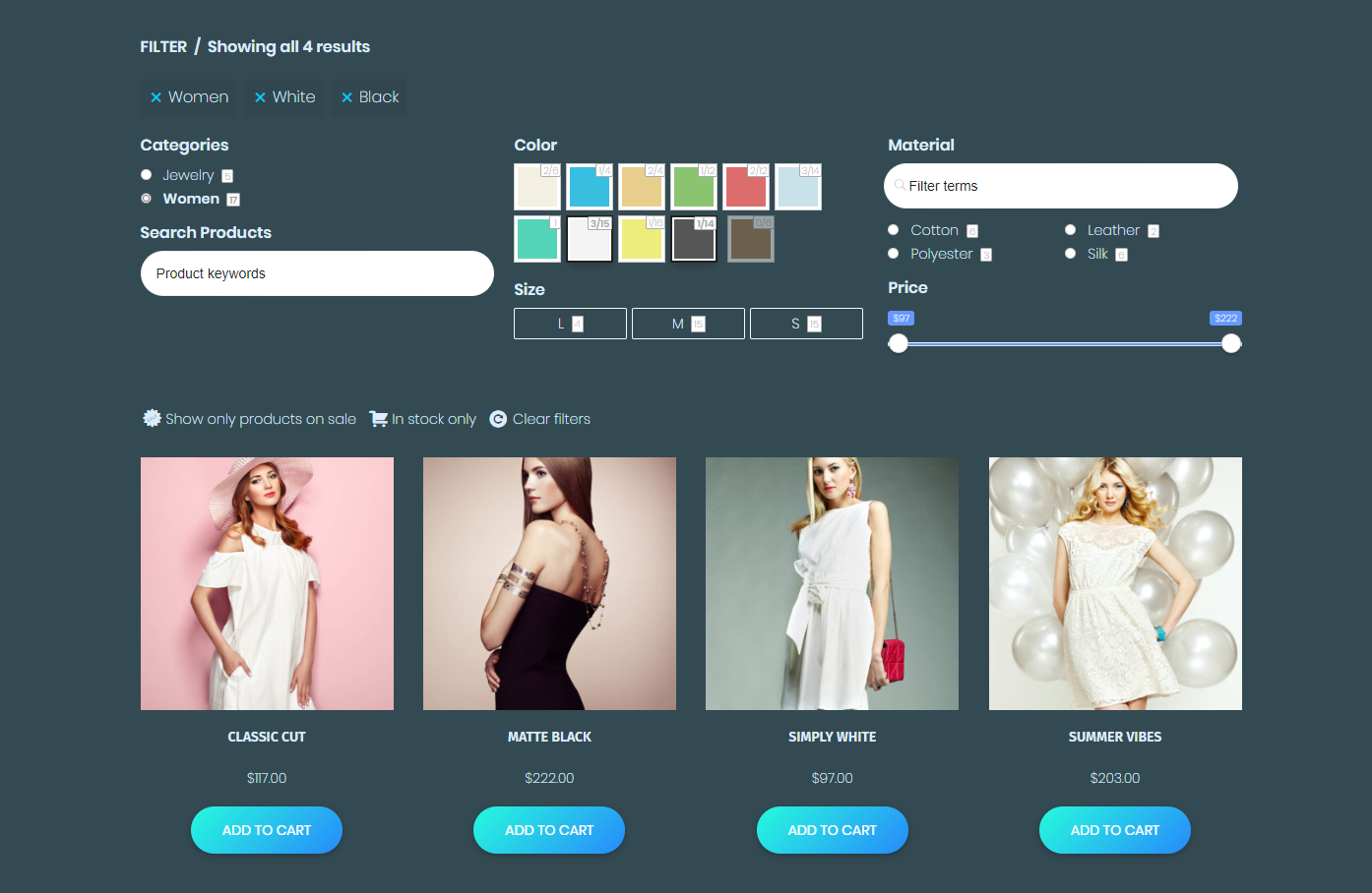 产品过滤器可在产品顶部使用,也可作为侧边栏中的小部件过滤器使用。 多个过滤器组可以同时添加到任何页面