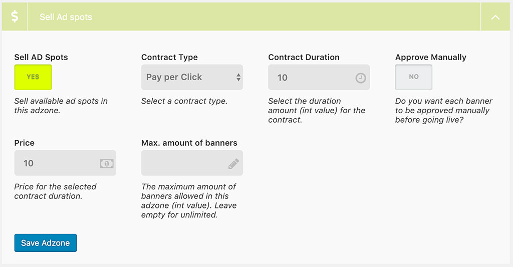 Adzones 可以对横幅进行分组并将它们显示为带有精美动画过渡的幻灯片。 您可以在网站上的任何位置放置广告区,并随时为其分配横幅。