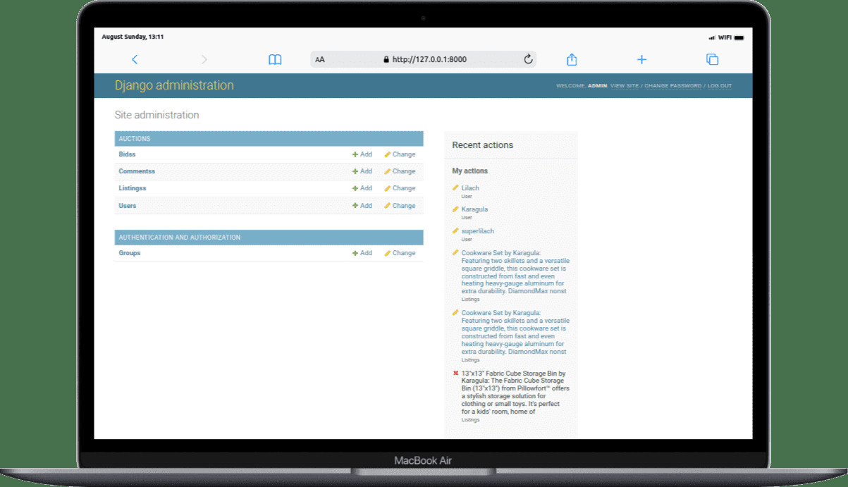 6. Django 管理界面:通过 Django 管理界面,站点管理员可以查看、添加、编辑和删除站点上的任何列表、评论和投标。