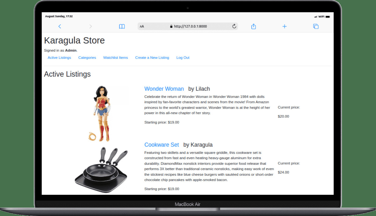在这个项目中,我开发了一个 eBay 风格的电子商务拍卖网站,它允许用户发布拍卖列表、对列表出价、评论这些列表,并将列表添加到“监视列表”。