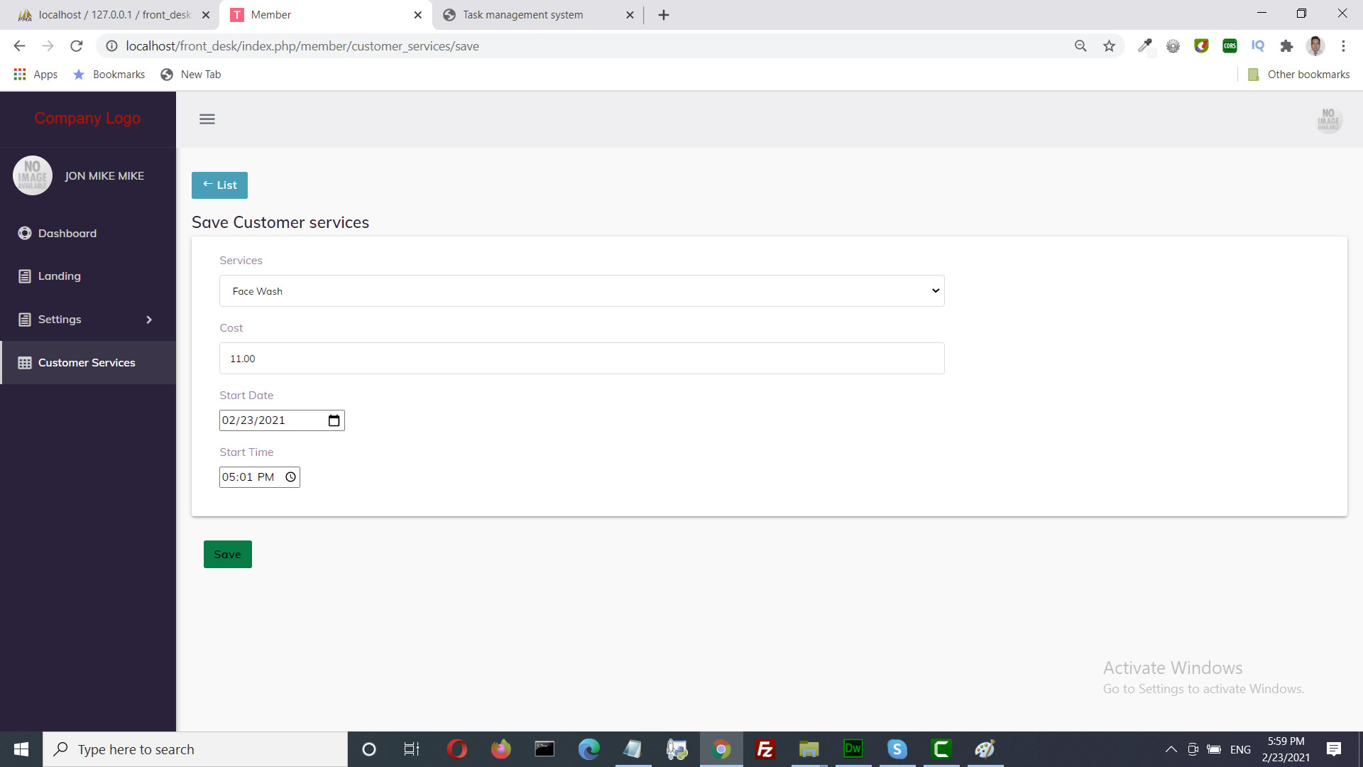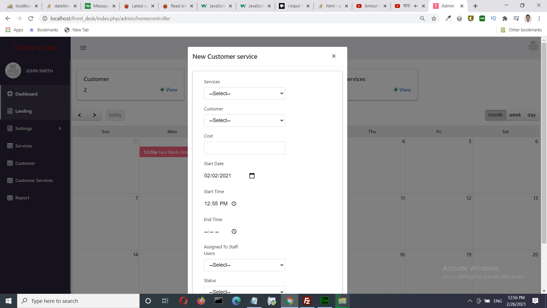 这是大中小型公司的任务管理系统(扩展版)。在此任务管理系统中,客户将注册并登录并创建预订时间表。他们也可以通过电话直接向管理员预订。管理员将创建一本包含客户信息和服务名称的书籍,并将设置日期时间。有服务列表及其成本、客户列表、开始日期和时间以及结束日期和时间以及工人。