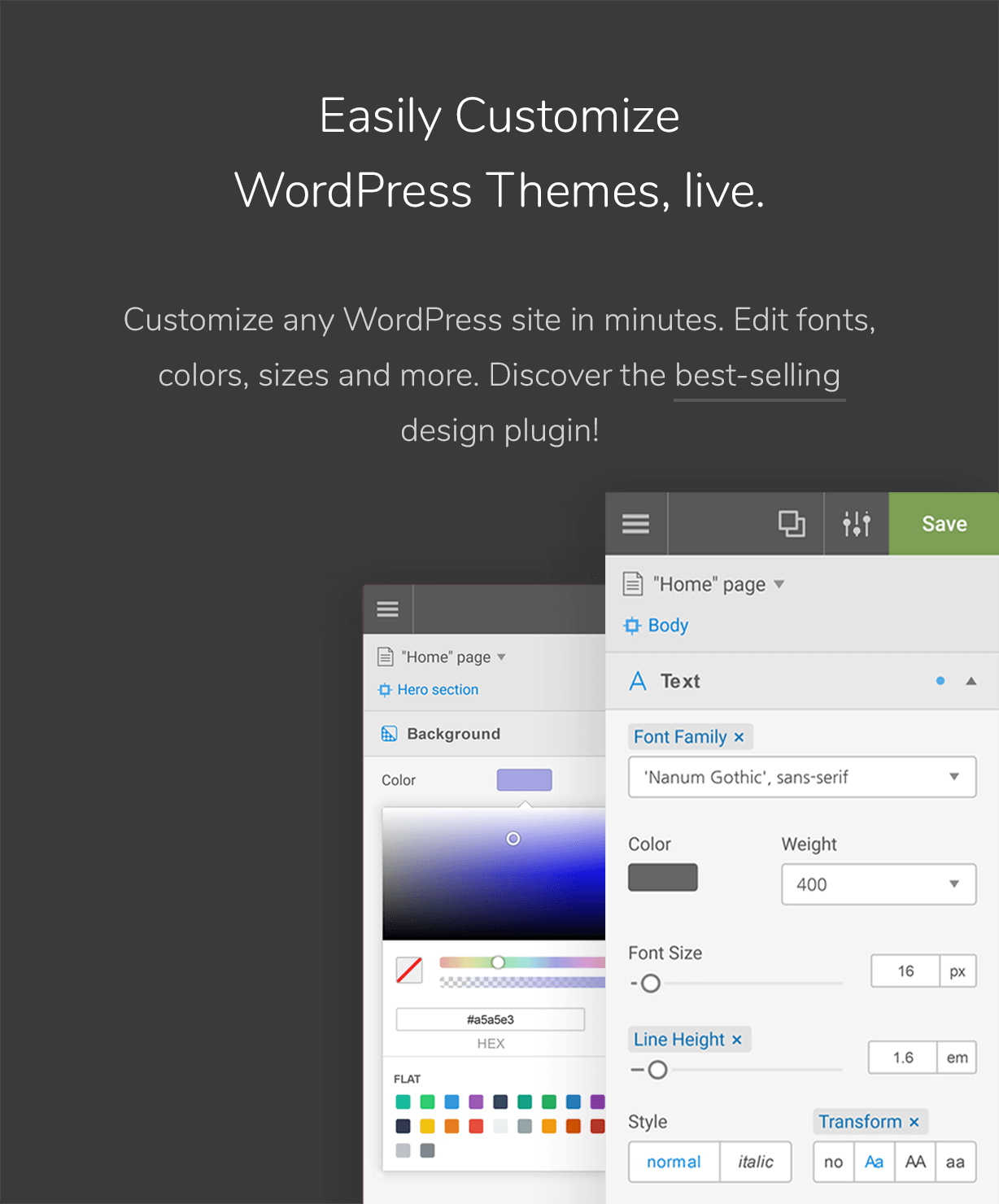 该插件允许您自定义任何页面和主题而无需编码。 单击一个元素并开始可视化编辑。 调整颜色、字体、大小、位置等等。 使用 60 多种样式属性完全控制您网站的设计。