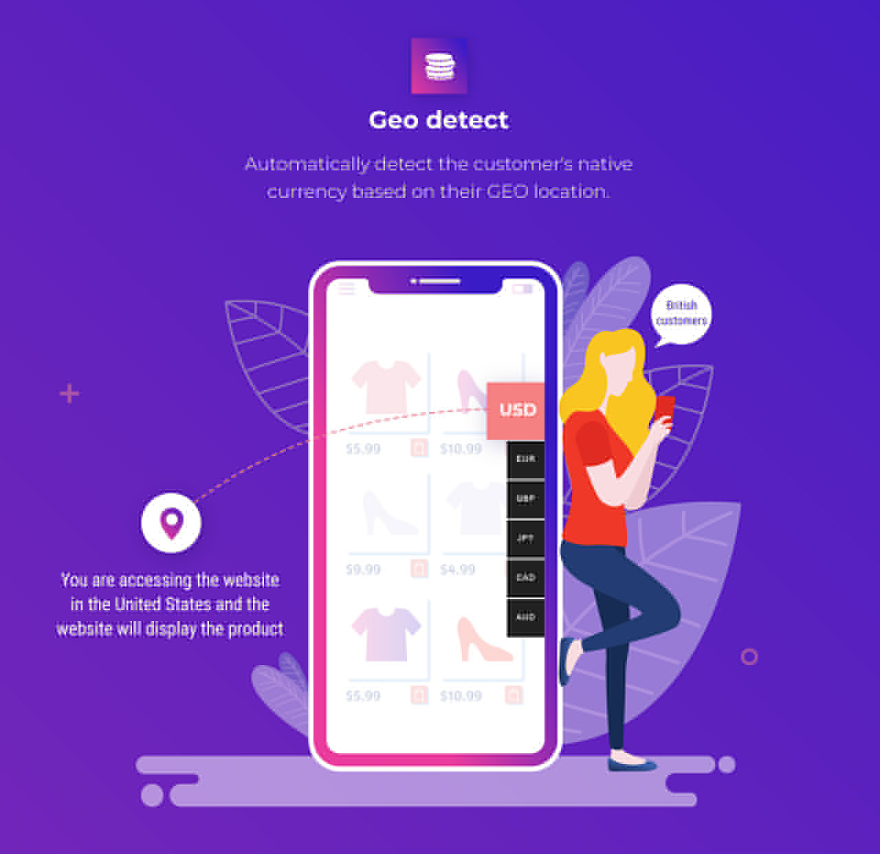 根据客户所在国家/地区检测货币:该插件将根据客户的 IP 地址检测客户所在的国家/地区,然后选择他们的货币以显示价格。