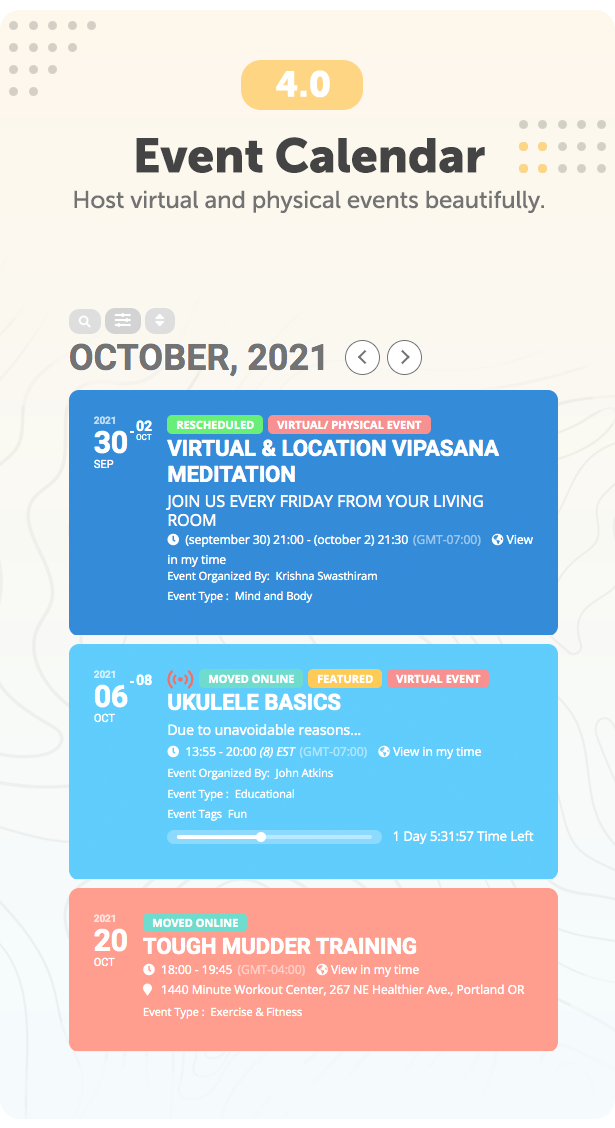 EventON 包含 200 多个有用的功能,例如高度可定制的重复事件、多个事件图像、无限的事件创建、各种日历布局设计、事件地点和组织者,以及多数据类型和语言对应事件等高级功能。所有这一切 包含在 codecanyon 排名第一的最畅销活动日历中!