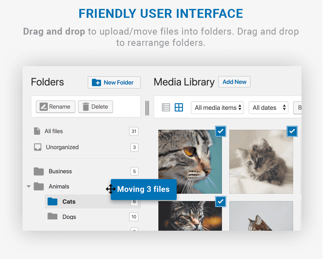 在 WordPress 中管理文件从未如此简单。您只需拖放即可上传或移动文件/文件夹。这将帮助您节省大量用于放置媒体文件的时间。文件夹的分层视图也将使您更容易在眨眼之间快速找到特定文件夹。