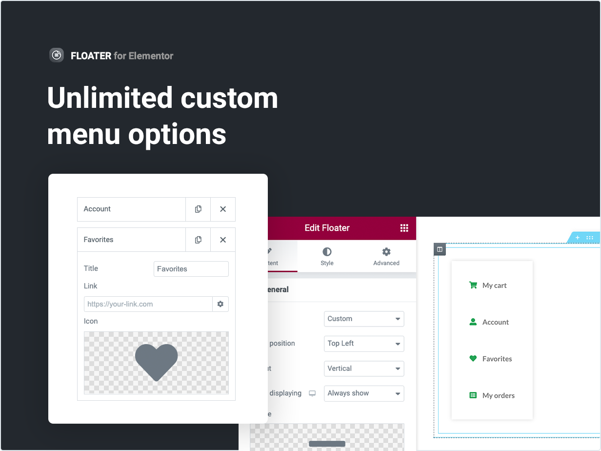 Floater 是 Elementor 的 WordPress 插件,用于为任何网站页面添加浮动或粘性菜单。该插件允许您创建用户将始终触手可及的导航,帮助他们快速获取所需信息,从而改善用户体验并轻松增加转化率。您可以在页面上的设置中的不同位置放置无限数量的浮动菜单。灵活的响应设置允许您管理不同设备的块显示。