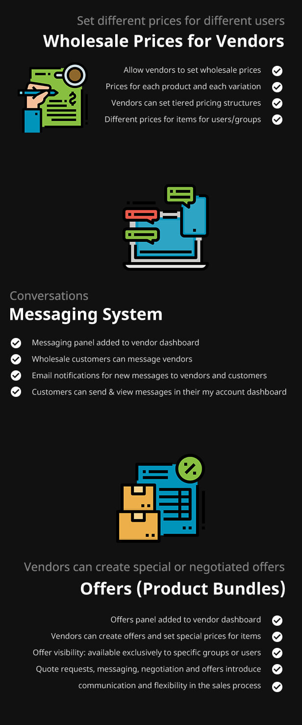 B2BKing for WCFM 将把您的 WCFM 市场转变为批发/B2B 多供应商市场,并允许您的供应商设置批发价格、产品可见性、价格等级、价格表、批量折扣、最低订单、消息传递、优惠等等!它将 B2BKing 的全部功能和功能带到您的商店。