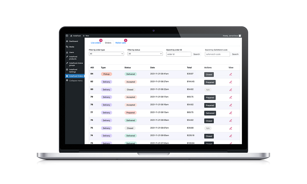 实时订单部分每隔几秒检索一次新订单。 一旦订单被标记为已接受,它将自动移至“订单”部分,员工可以从中轻松更改其状态(已接受、已拒绝、已准备好、已交付和已关闭)。