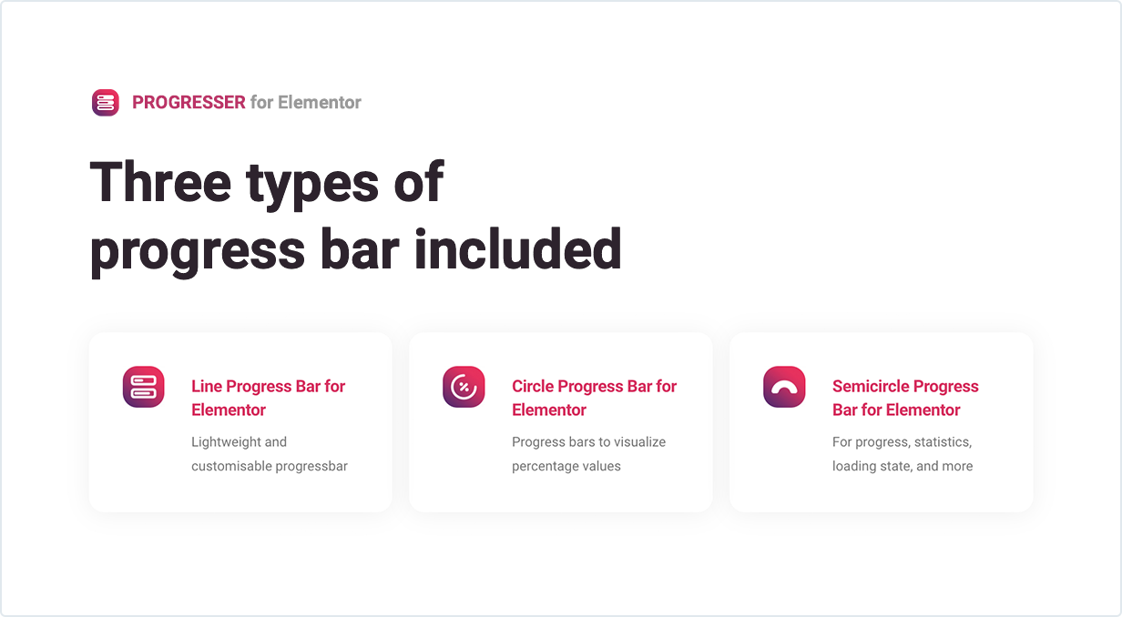 Progresser 插件带来了三个独立的 Elementor 小部件,具有详细的功能设置和灵活的样式,以实现您的设计目标。 它们中的每一个都允许您通过管理块中每个项目的位置、选择所需的值和单位来获得一个独特的进度条。 随意从库中选择一个图标或使用您自己创建的 SVG 图标。 控制动画的速度、缓动和类型。 您对页面或整个站点的进度条数量没有限制。