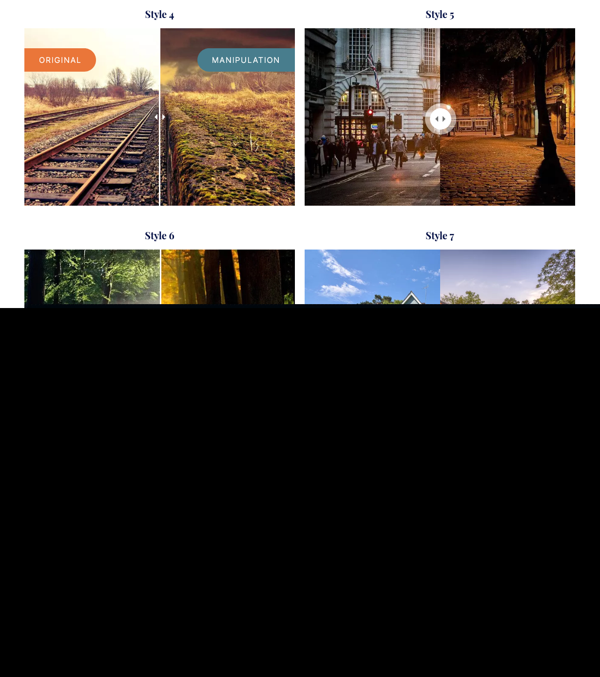 使用单个图像创建之前之后滑块。单张图像具有灰度、模糊、饱和、棕褐色等滤镜效果。滤镜可以添加在之前或之后的图像上。