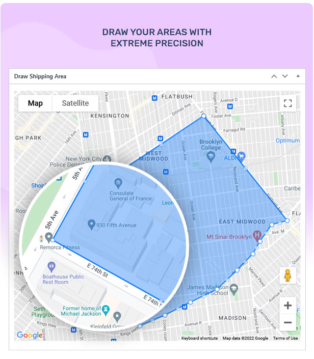 您可以通过直接在 Google 地图上绘制来创建精确的送货区域。这使您有机会做到如此精确,以便您可以在街道的一侧服务,而另一侧则在您的服务区域之外(如果需要)。当然,这是一个极端的例子,只是为了给你一个可以实现的例子。
