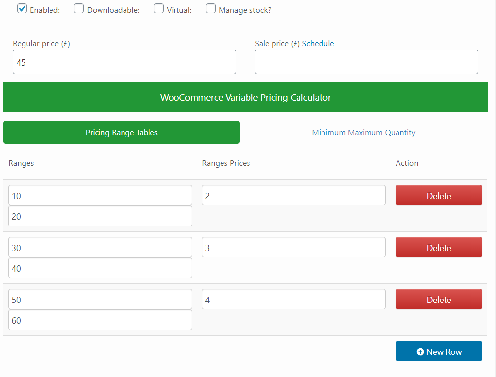 现在,您为每个变体设置了一个定价范围表,如下所示,可以为您的产品设置变体,并且它们的范围定价没有限制使用您的母产品定价表。