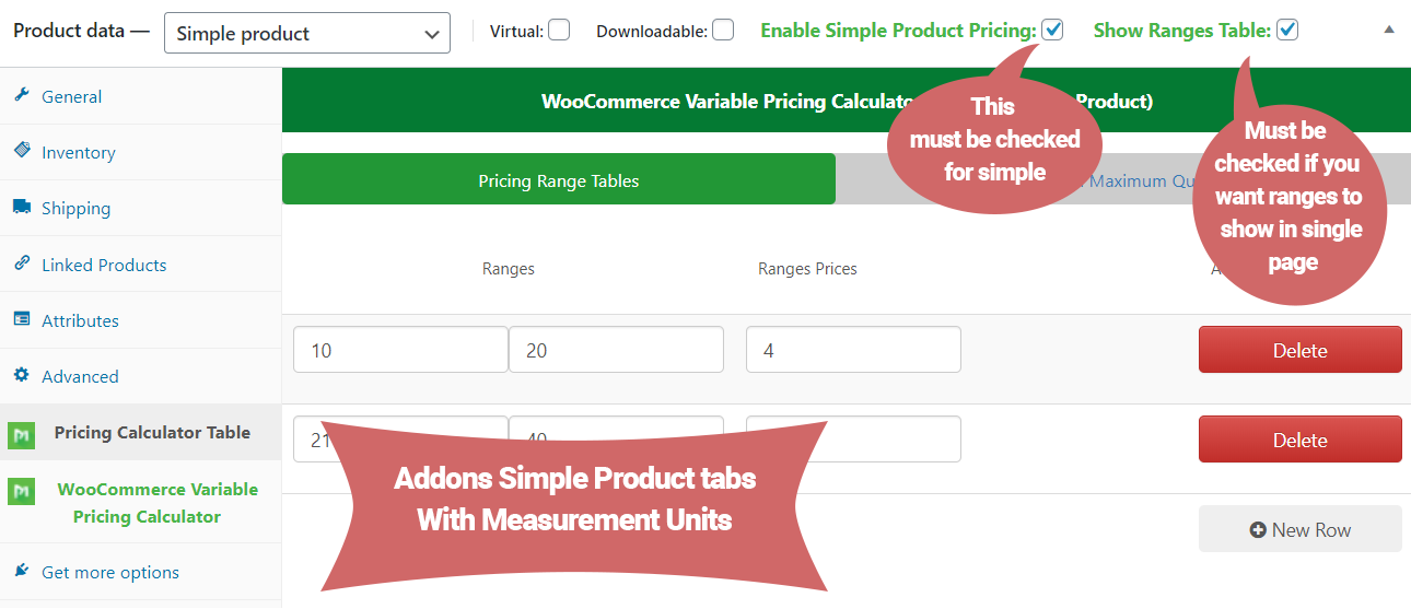 安装后转到产品页面,在图像中查看如下所示的插件选项卡。因此,关键部分是选中启用简单产品定价选项复选框,让产品作为简单测量产品工作。如果要在产品页面上显示范围,请启用名为“显示范围表”的第二个复选框。选择测量集字段标签,保存后输入范围表简单产品就像测量计算器一样工作。