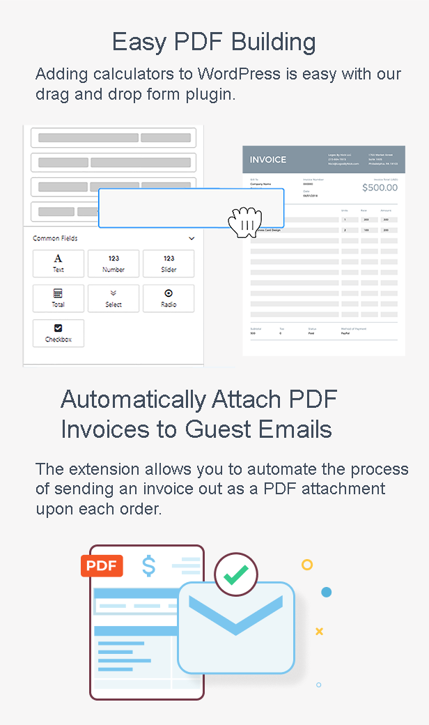 轻松拖放元素以构建和自定义 PDF: – 用户友好的 pdf 模板构建器允许您构建专业且出色的 WooCommerce PDF 模板。