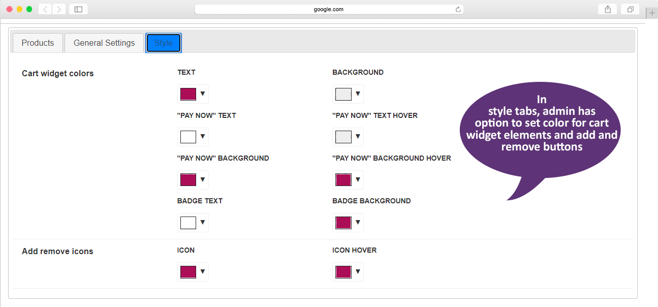 在样式选项卡中,我们添加了颜色小部件,允许管理员为购物车小部件和产品元素颜色设置颜色。
