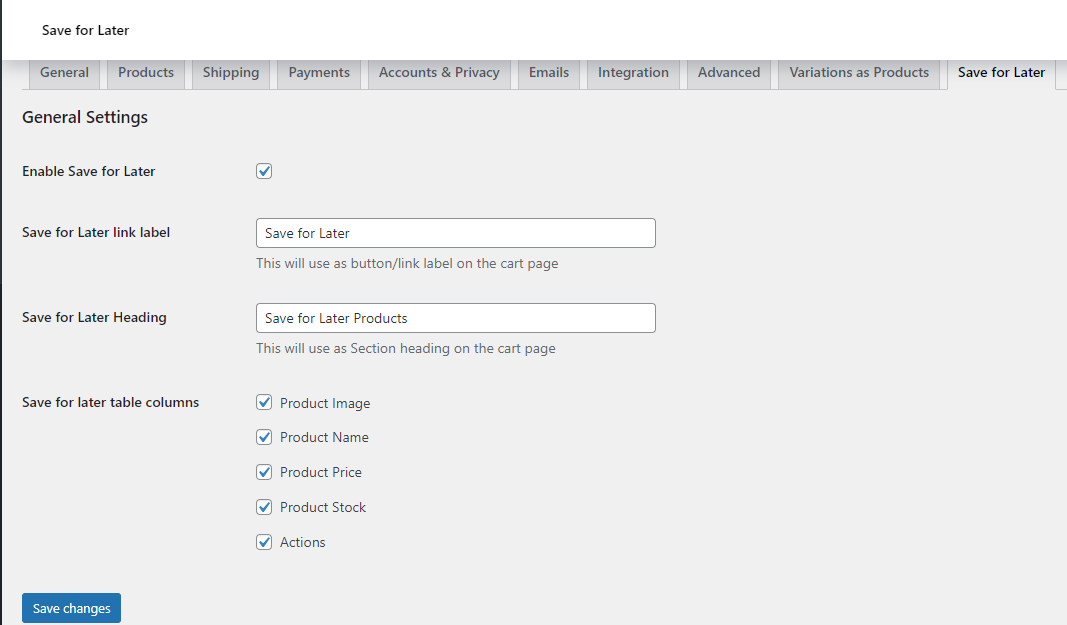 要使其工作,只需按照安装说明并激活插件即可。安装后,导航到 WP Admin Dashboard > WooCommerce > Settings > Save for later 并配置您的设置。无需编码。