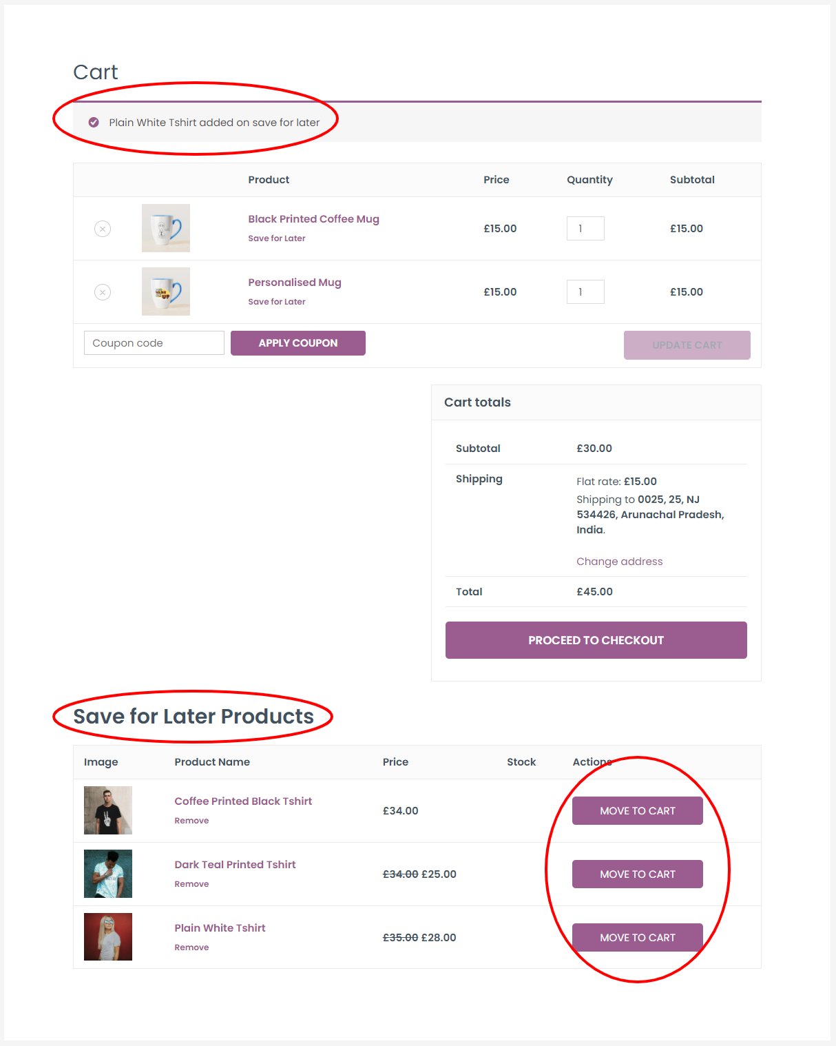 您的客户可以将他们当时不打算购买的产品从购物车移至“稍后保存”列表。保存在他们列表中的产品将显示在购物车页面、我的帐户页面上,您的客户可以再次将这些产品添加到他们的购物车并完成购买。