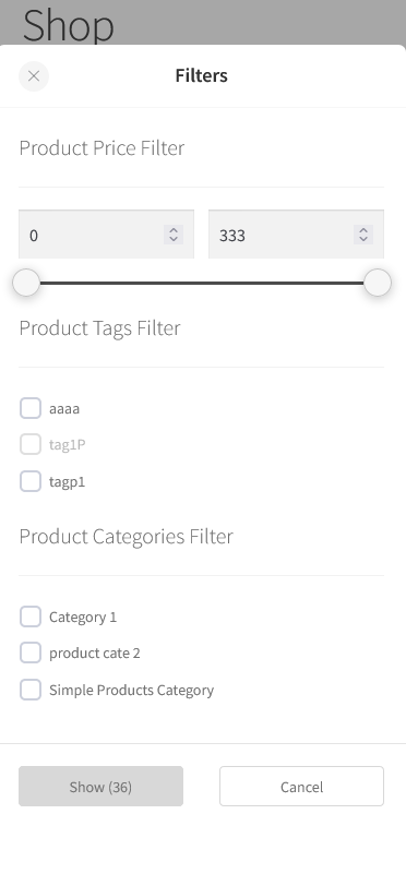 要启用过滤器弹出小部件,您需要转到过滤器 > 设置并激活“适用于移动设备的特殊弹出过滤器小部件”选项并保存设置。之后,“过滤器”按钮应出现在产品列表上方,并且将在智能手机上可见。单击该按钮将打开弹出过滤器小部件。