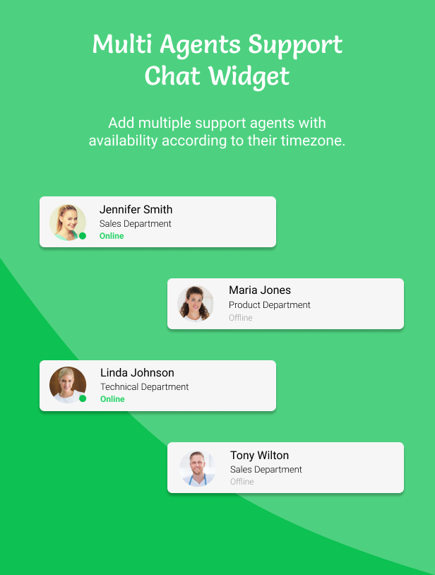 您可以在聊天小部件中轻松缩短聊天代理,支持代理将显示在该位置。 为座席添加时间表和时区,并设置在线/离线状态。
